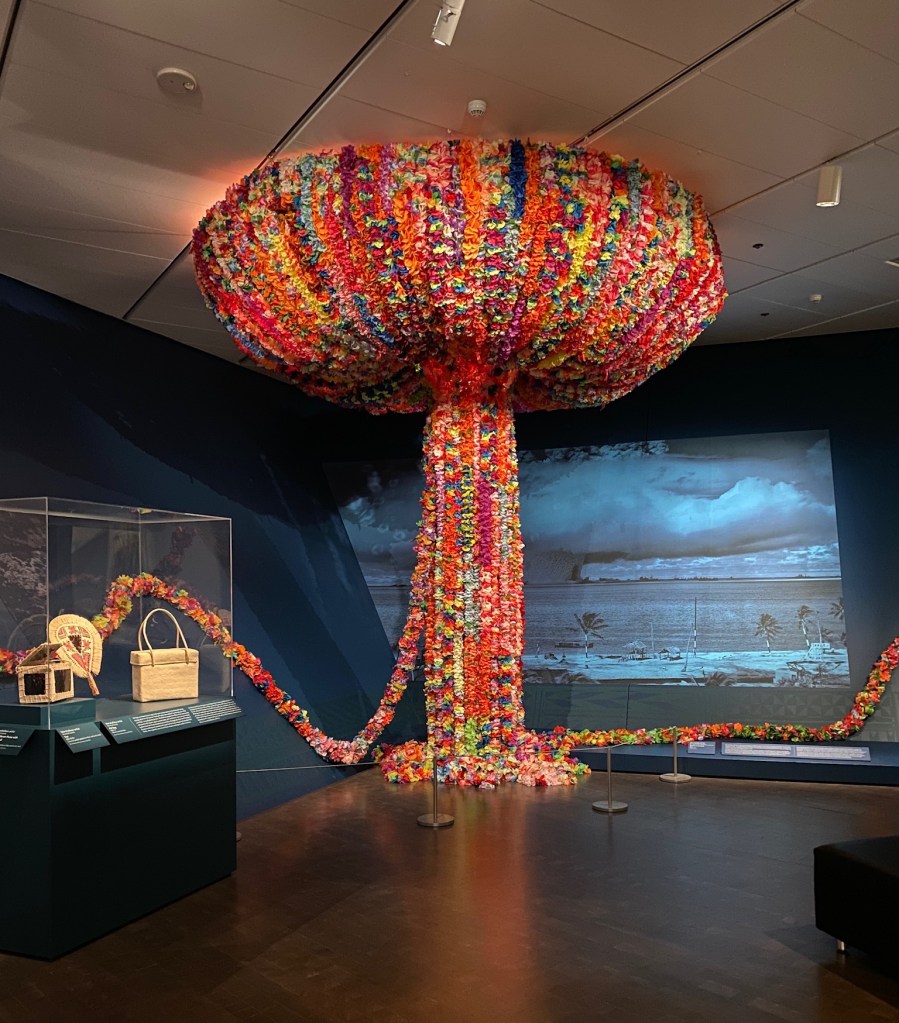 We go next to the Islands Beyond Blue exhibit, which opens with a huge installation created from leis and includes other works from the museum’s collection, including historical monumental sculpture, delicate bark cloth and intricate wood carvings.